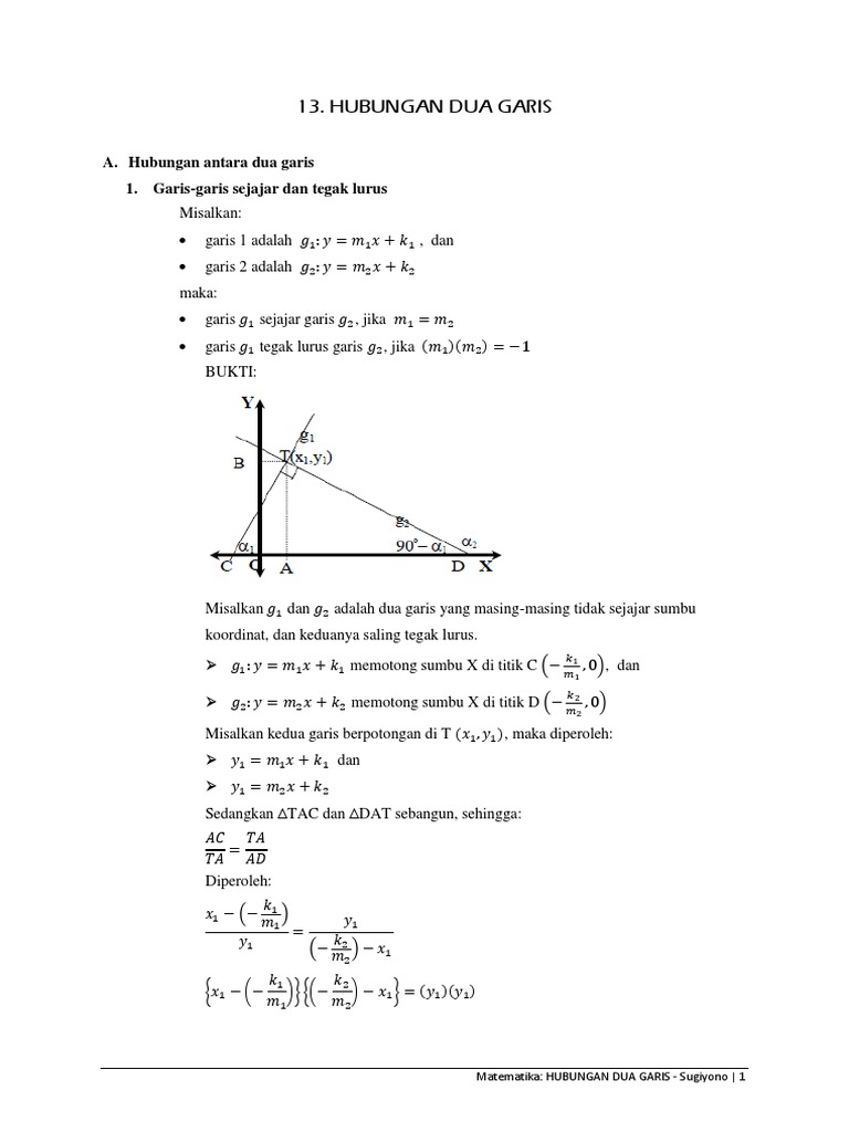 Jika kita memiliki dua buah garis lurus maka kedudukan kedua garis tersebut adalah sejajar dan berpotongan. Bidang grafik antara sumbu disebut sebagai kuadran. Dua buah titik yang membentuk sebuah garis yang sejajar dengan sumbu x dan tegak lurus dengan sumbu y mempunyai ordinat yang sama.