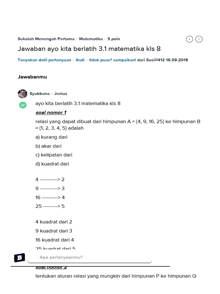 1 Relasi Yang Dapat Dibuat Dari Himpunan A 4 9 16 25 Ke B 1 2 3 4 5 Adalah A Kurang Brainly Co Id
