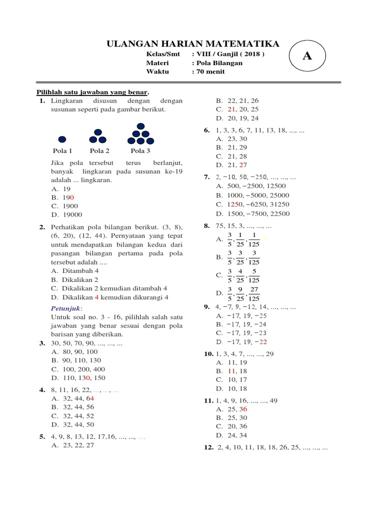 Soal Nomor 3 16 Pilihlah Salah Satu Jawaban Yang Benar Sesuai Dengan Pola Barisan Yang Brainly Co Id